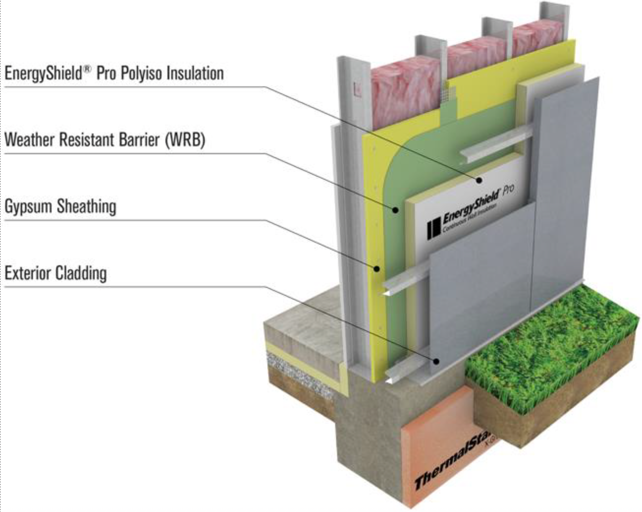 EnergyShield Pro wall insulation combines high R-value, durability and water resistive barrier attributes in a high performance continuous insulation. It is composed of a Class A fire-rated, closed cell polyiso rigid foam core faced with an embossed white acrylic-coated aluminum foil facer on the front and a reflective foil facer on the back.
